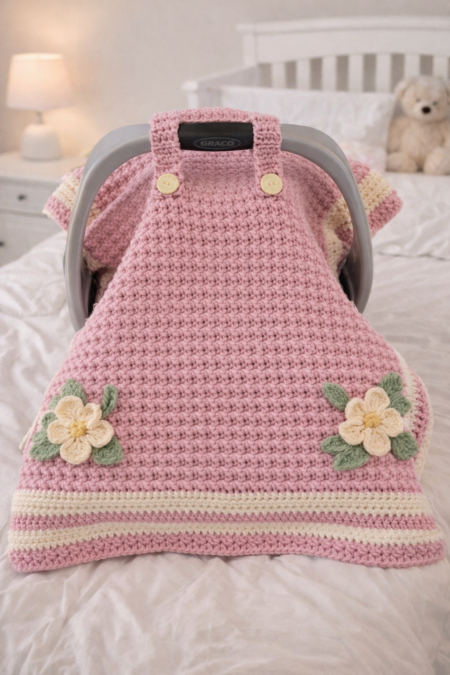 If you’re looking for a practical and adorable crochet project for babies, this car seat blanket with floral details is simply perfect.