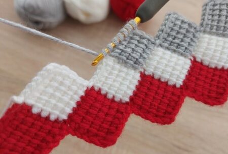 The Entrelac crochet stitch creates a beautiful pattern made of small interlocking blocks that resemble woven fabric.